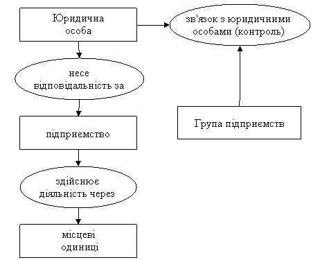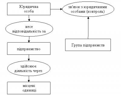 Модель реєстру підприємств для статистичних цілей передбачає зв'язки між його компонентами: юридичними особами та статистичними одиницями - підприємствами, місцевими одиницями, групами підприємств (рис.2.2.) .